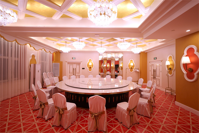 皇宮廳—金碧輝煌、皇宮式裝修,面積1038㎡,層高8.6米,配備愛情階梯、軌道威亞、二層觀禮臺、浪漫燈光秀、旋轉升降舞臺、頭頂天幕連接開合大屏。可承接50桌的大型宴會,也可舉辦600人的大型會議;還可用作會展、車展場地,每逢節假日還為市民上演文藝節目。